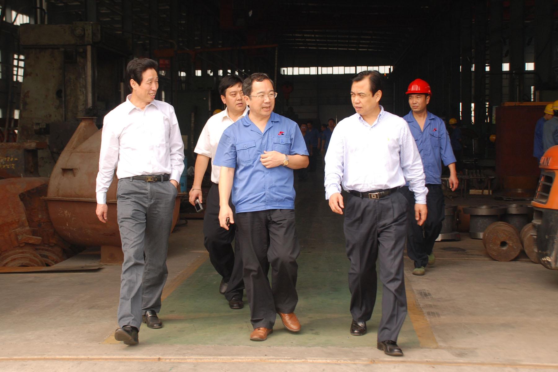 任沁新一行先后到重機廠、金結(jié)廠以及在新廠區(qū)生產(chǎn)作業(yè)的中凱礦機公司、華凱鑄鍛鑄鐵廠現(xiàn)場實地考察。來到一個同行業(yè)的生產(chǎn)現(xiàn)場,他倍感親切,不時地在不同生產(chǎn)設備及半成品、產(chǎn)成品前和公司董事長侯向保親切交談。