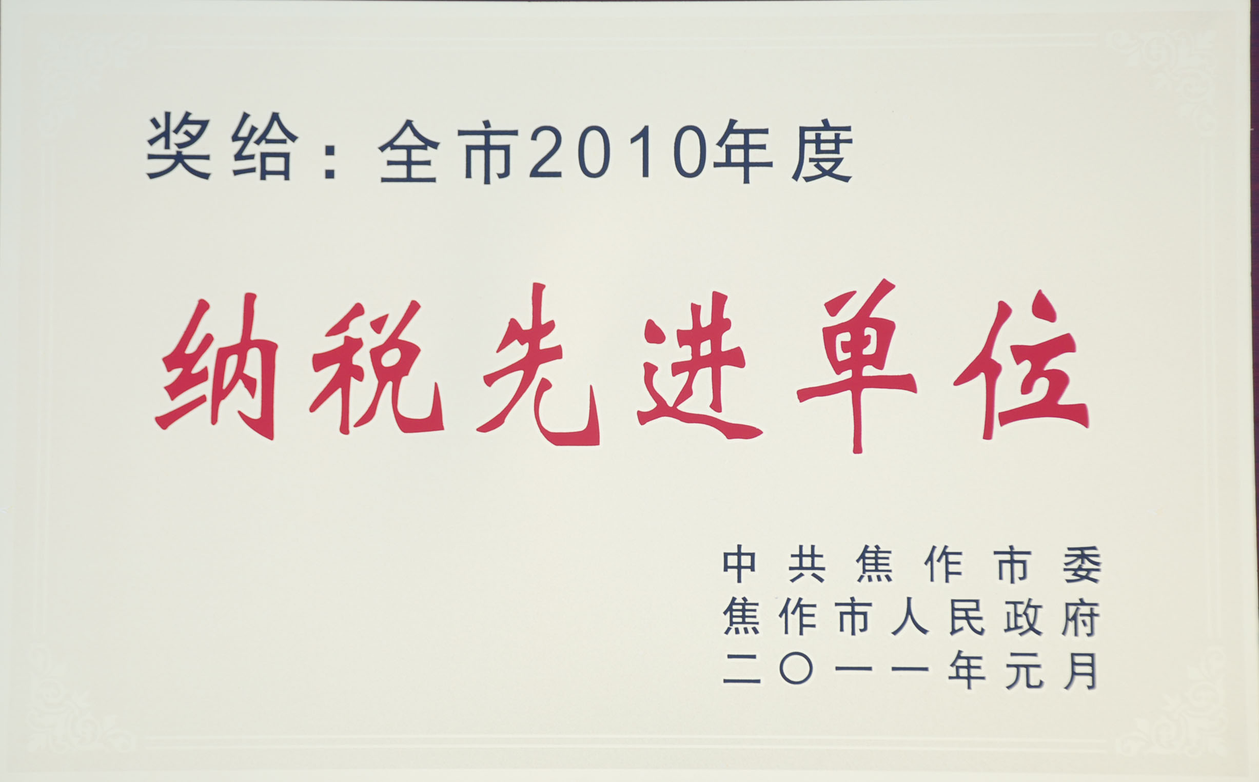2月14日 市政府召開財稅及工業(yè)發(fā)展總結(jié)表彰大會。公司被焦作市委、市政府授予全市2010年度“納稅先進單位”稱號。(公司辦)